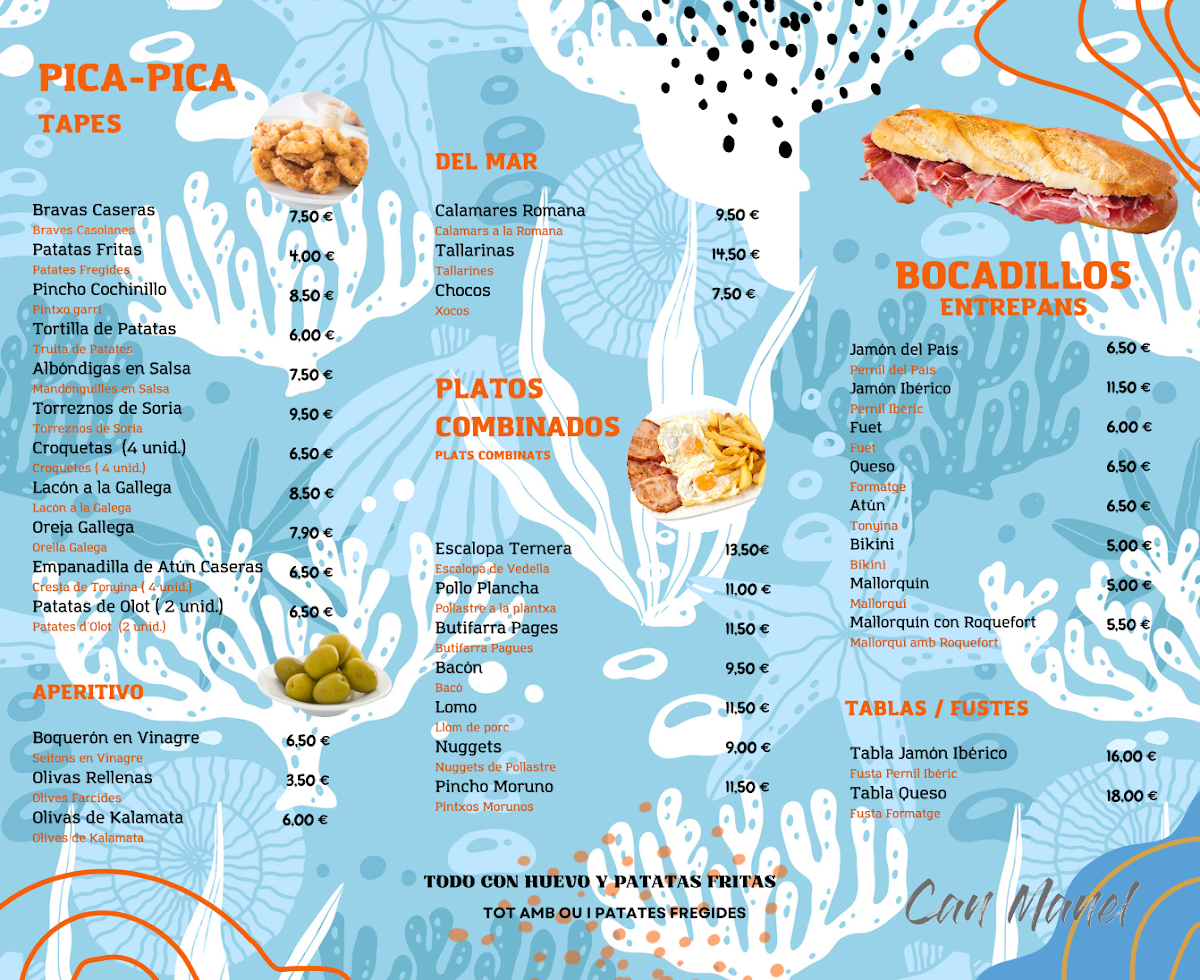 Introducing the menu at Can Manel, nestled in the charming seaside town of Cubelles, Barcelona, this tapas bar offers an inviting blend of traditional and casual dining. The menu shines with homemade classics that make every bite memorable. Fresh Ensaladas like the Can Manel Salad, with cherry tomatoes, tuna, hard-boiled egg, and crispy onions, set a fresh, flavorful tone. From the sea, dishes such as Calamares a la Romana and tender Tallarines highlight the restaurant’s seafood expertise.